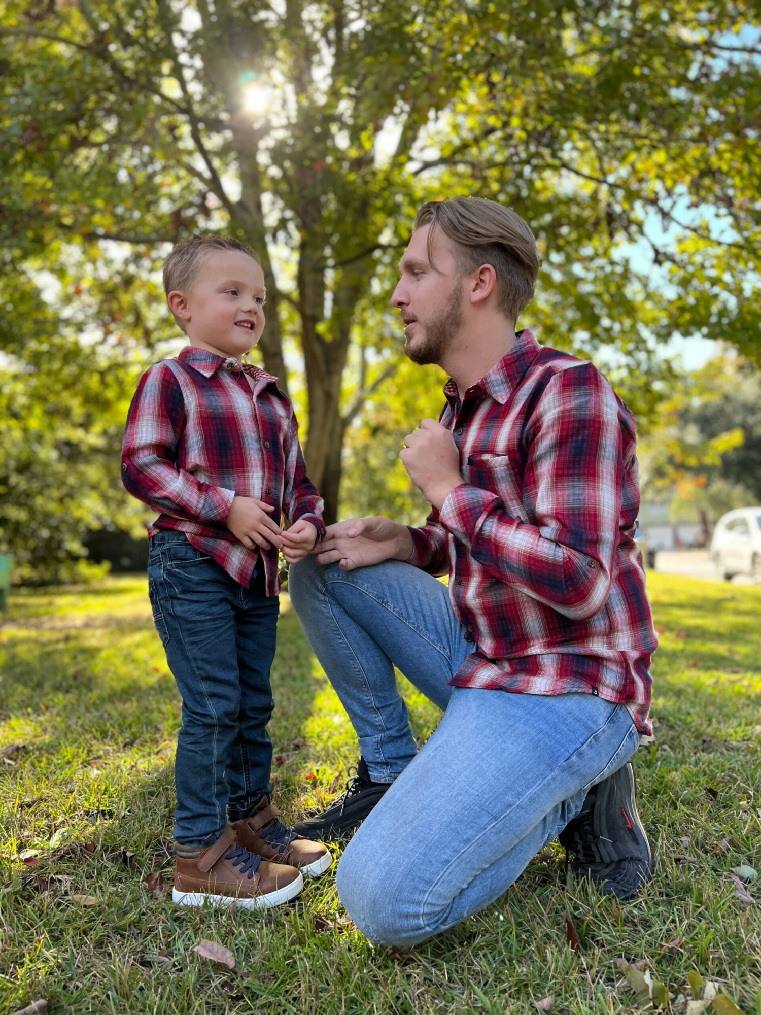 Every single one of our woven shirts has a babies woven shirt to match which also matches with the Daddy sizes! If you get all three matching, please please please send the pic to Instagram – @meandhenrykids