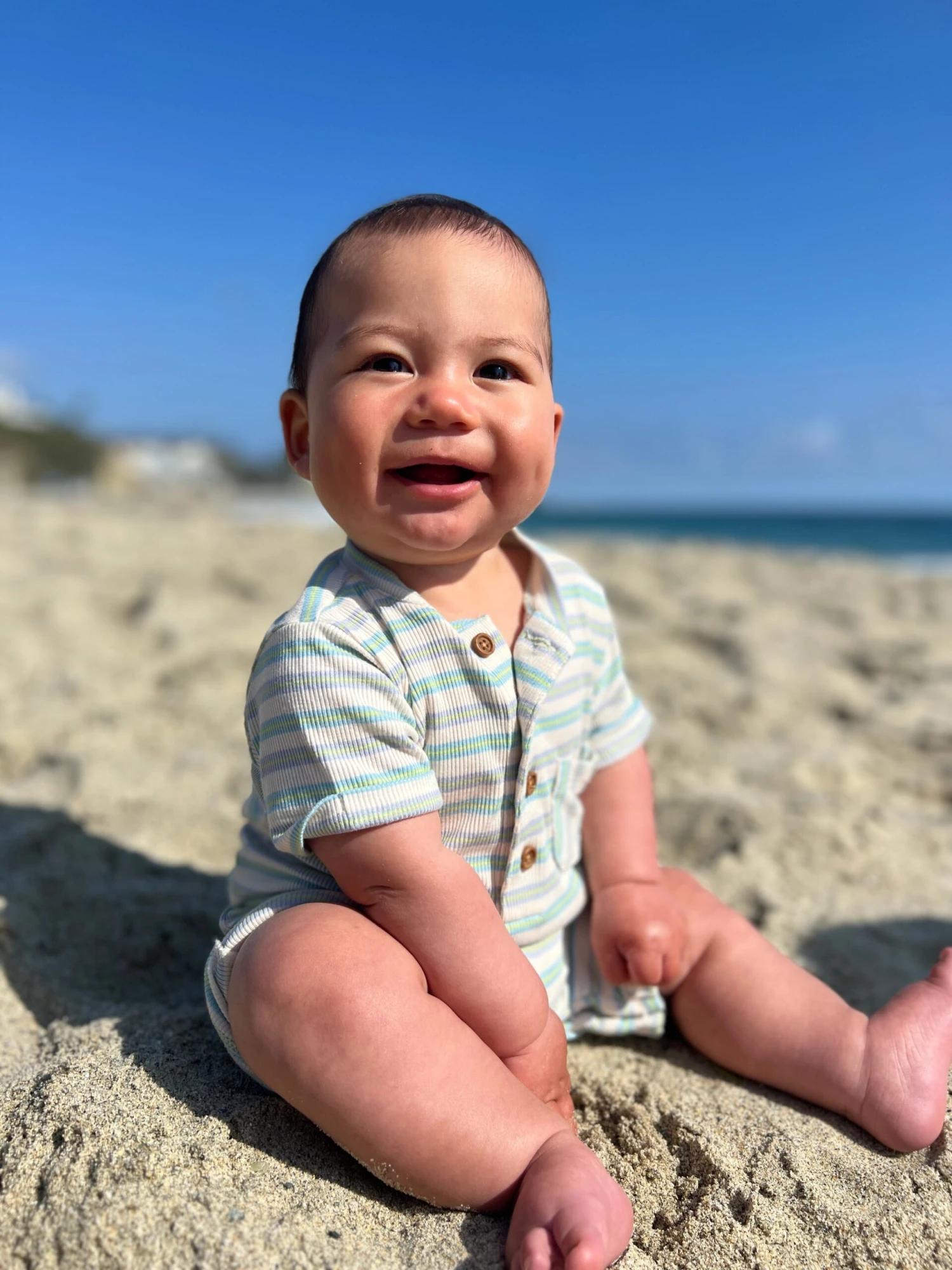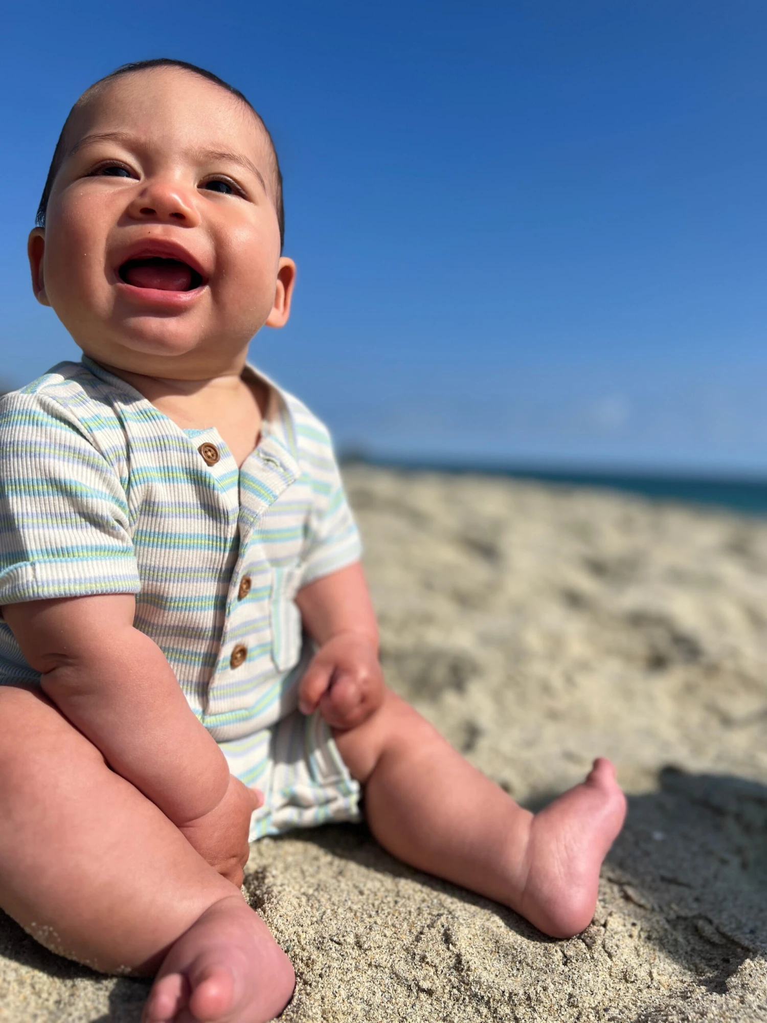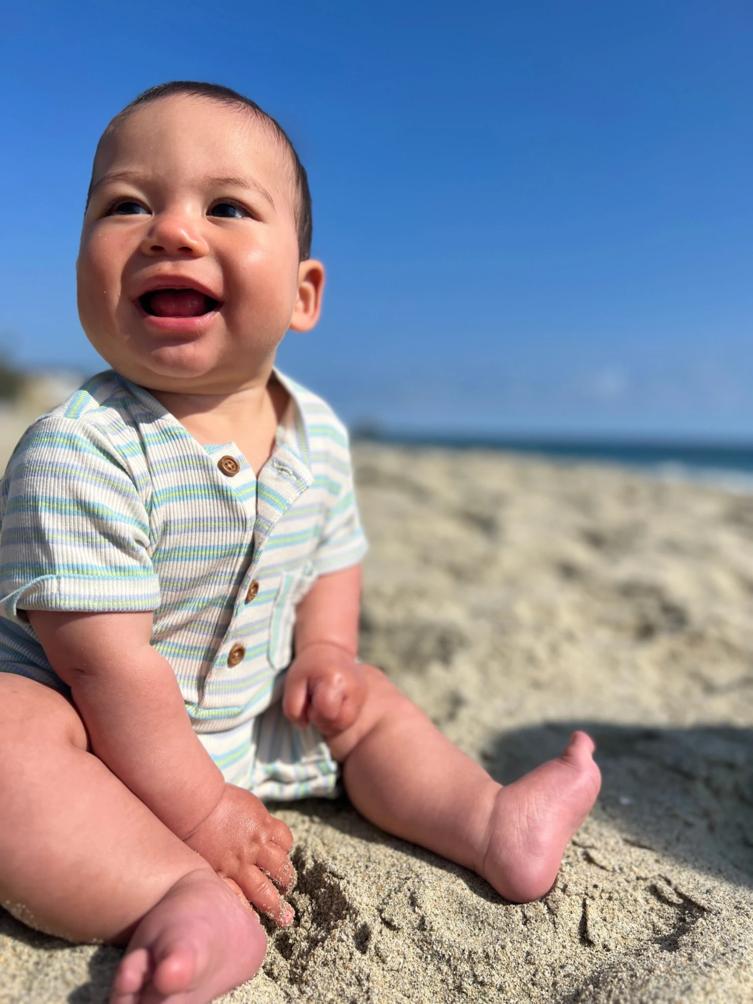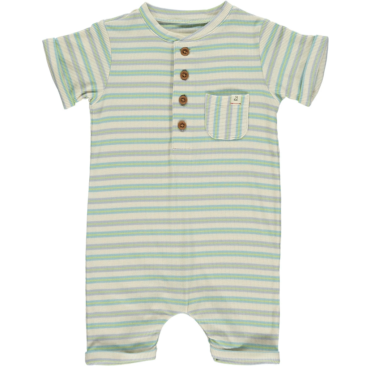 Our adorable shortie romper features a classic styled Henley neck and comes in a fun colour combination of beige, lime, and grey. Perfect for everyday wear and playtime.