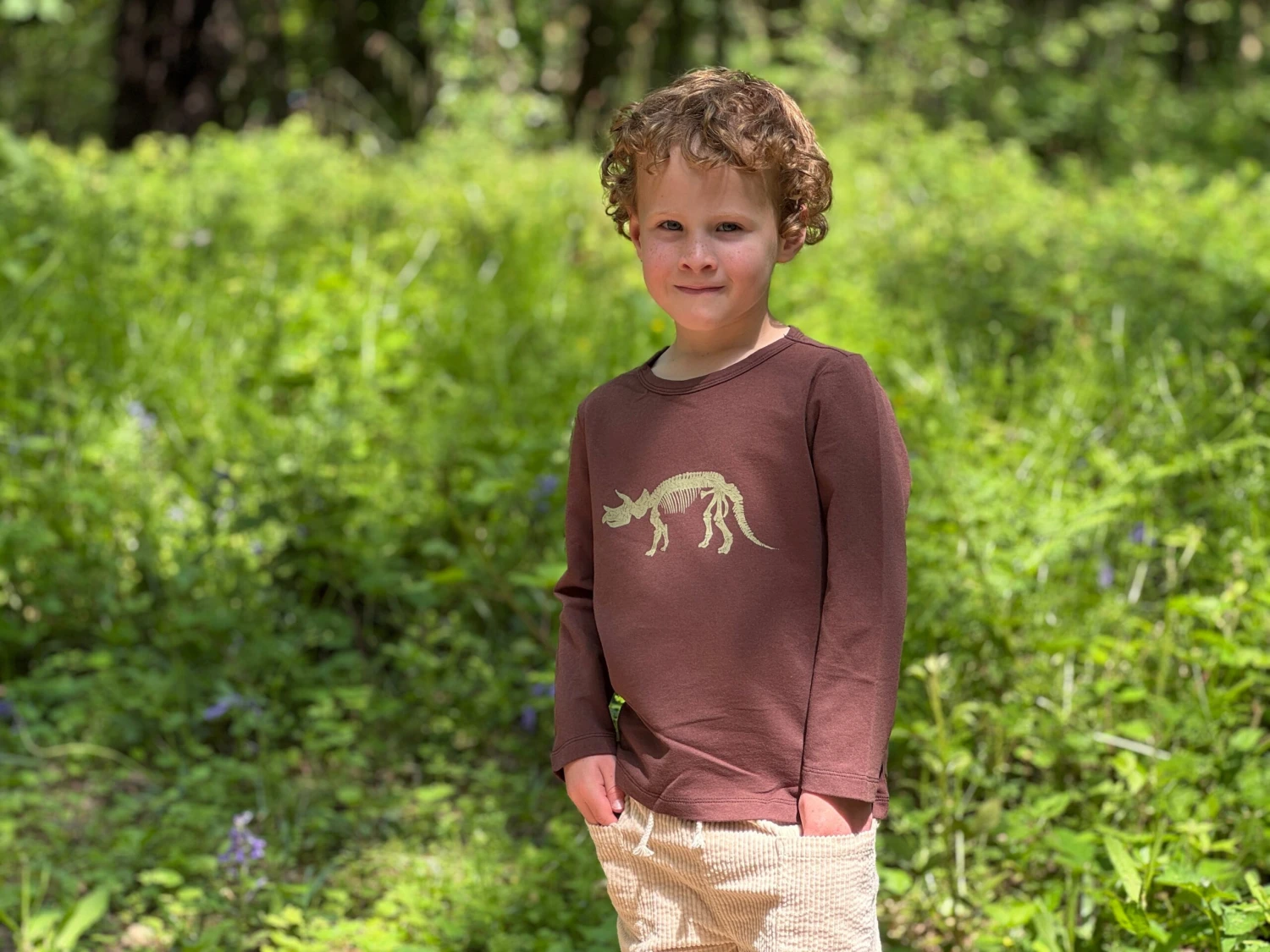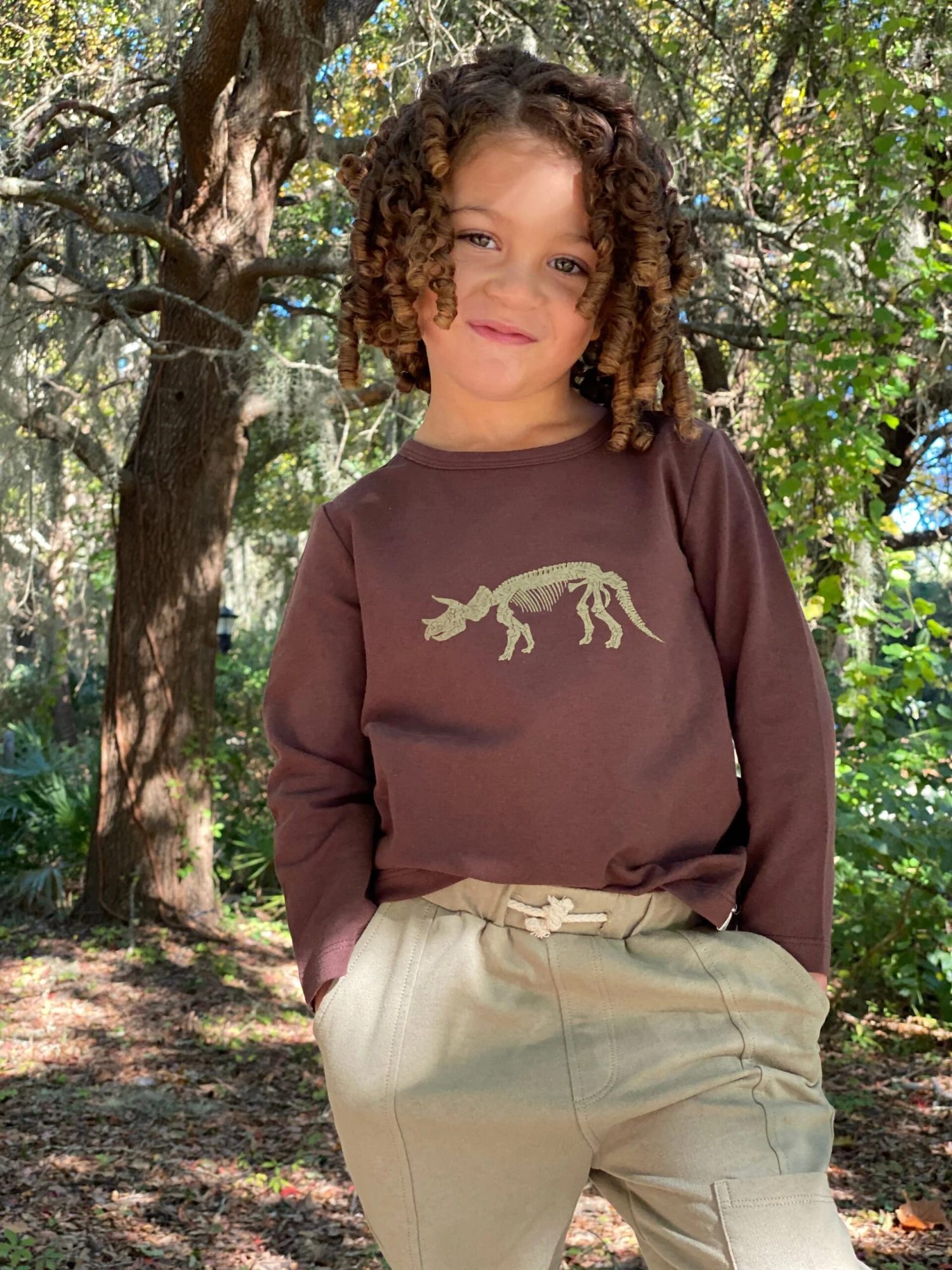 Discover a ROAR-some blast from the past with this Brown Dino Skeleton Printed Tee! Let your little one journey back in time and explore the Jurassic era in this playful and fun shirt. Get ready for some prehistoric fun!