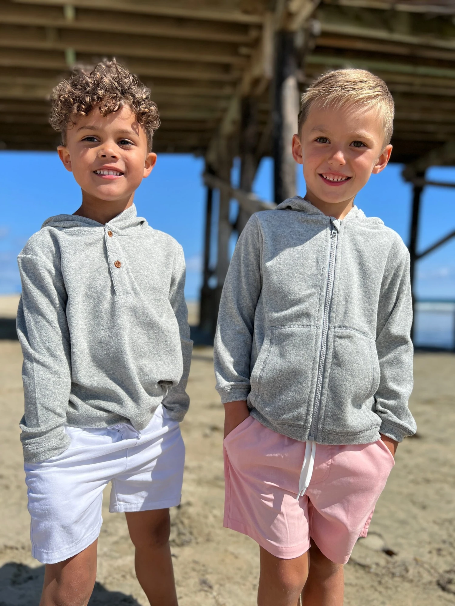 Get cozy this spring with our DEVON Terry Towelling Grey Hooded Top! Made with soft and durable material, this playful top is perfect for your little one’s adventures. So let them run wild (and stay comfy) with this kiddo-approved must-have!