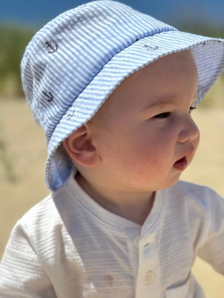 Crafted from soft, breathable seersucker fabric, this hat offers both comfort and functionality, making it ideal for beach trips, family outings, or casual playdates. The classic anchor print adds a charming maritime touch, giving it a playful yet timeless vibe that pairs well with a variety of outfits.