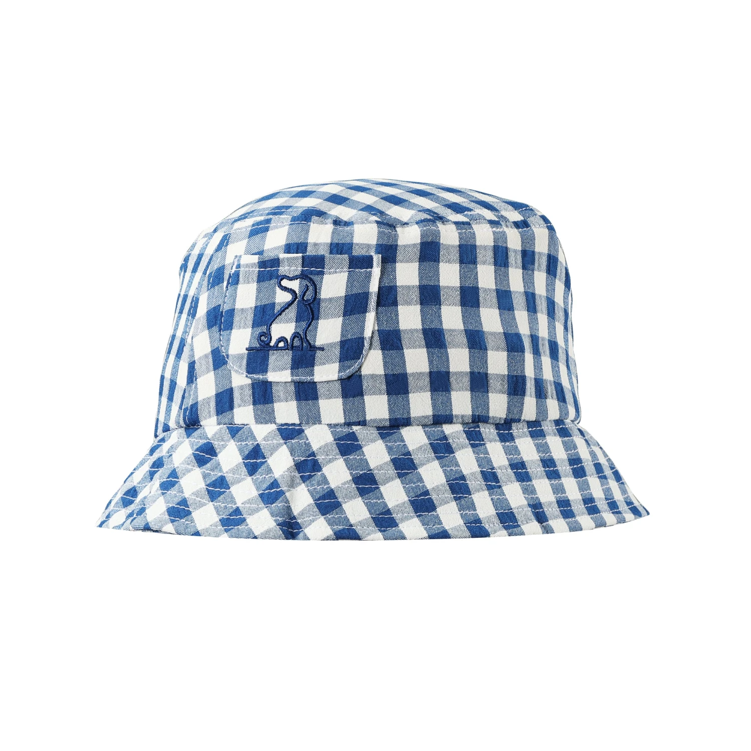 Crafted from soft, breathable woven fabric, this hat combines the laid-back style of a bucket hat with the sophistication of a classic navy and white plaid pattern, making it ideal for outdoor adventures, family outings, or everyday play.