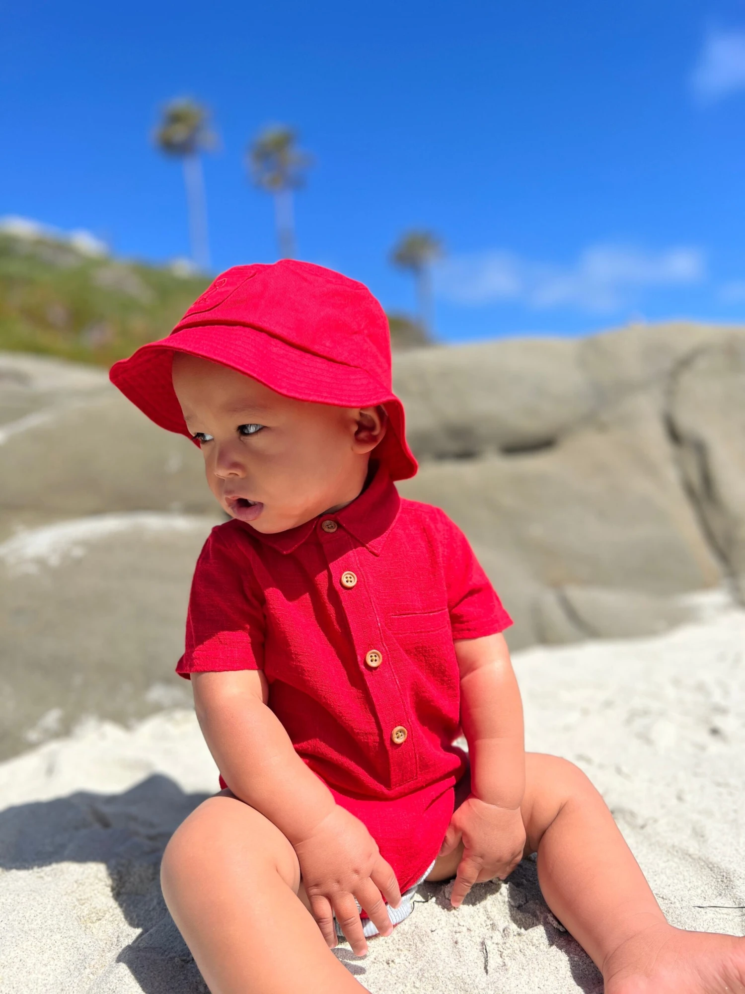 Jazz up beach trips with our bright red twill bucket hat. Not only will this protect your kiddos head he will stand out in the crowd!Β