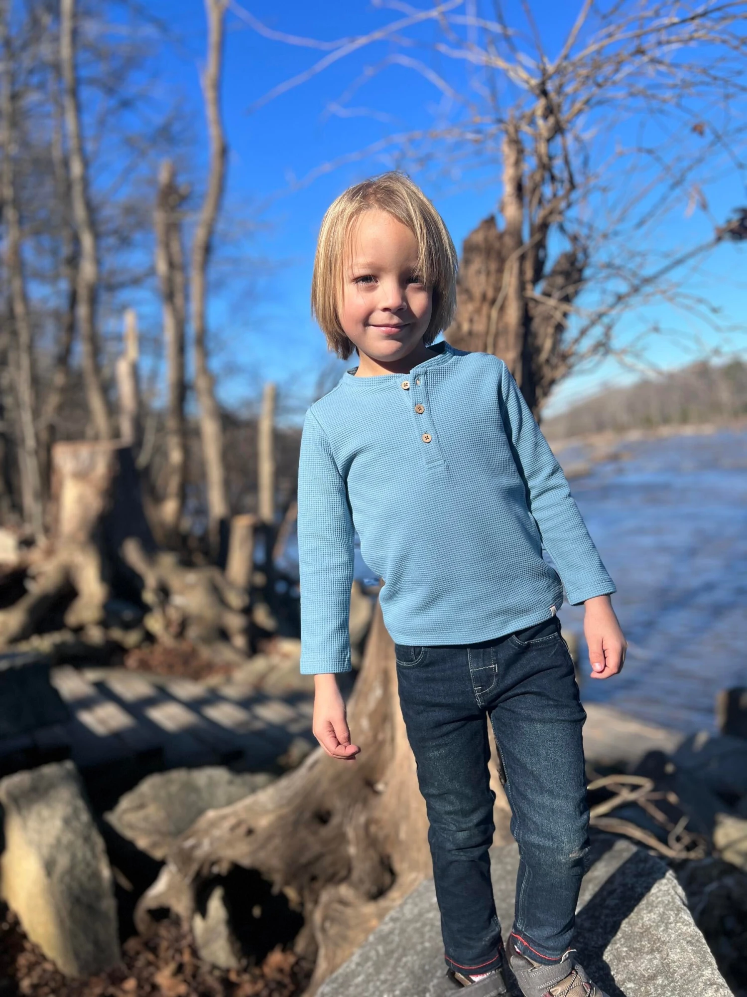Perfect for the fall season, this blue waffle Henley tee is a cozy essential for your little one.ย
