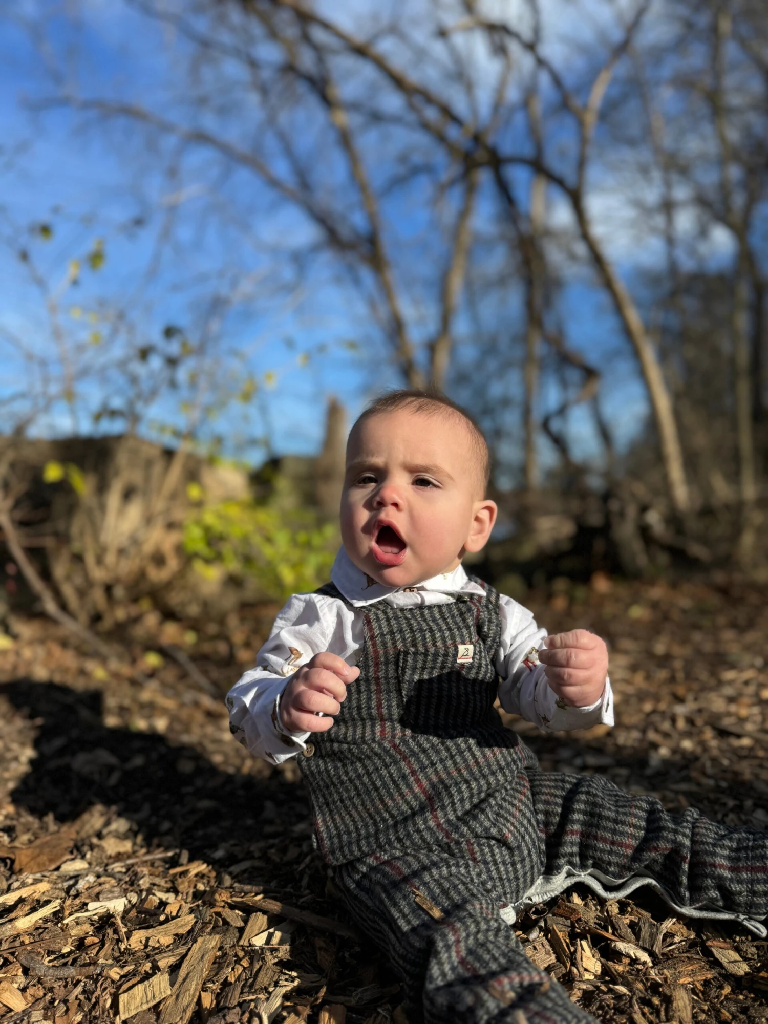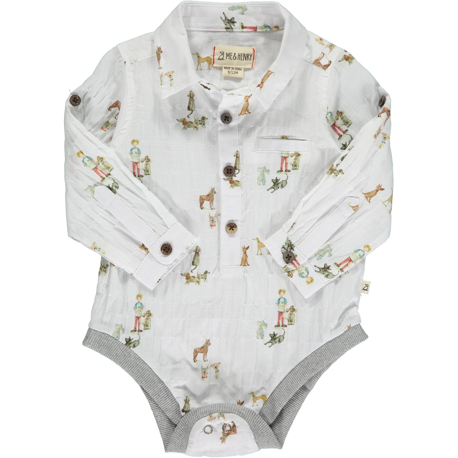 Swaddle your little one in the cutest onesie! This white all over print Henry woven onesie is the perfect way to keep your tot warm and cozy, while also looking adorable and smart with the Henry dog print.