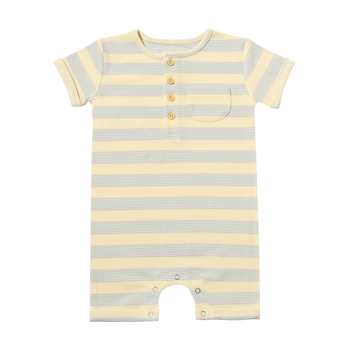 This grey and cream wide stripe henley romper is a super stylish one-piece outfit with classic henley detailing for a timeless yet modern look. Perfect for comfy summer play days.