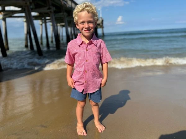 The red and white micro plaid woven shirt is the perfect blend of classic style and playful flair for your little one!