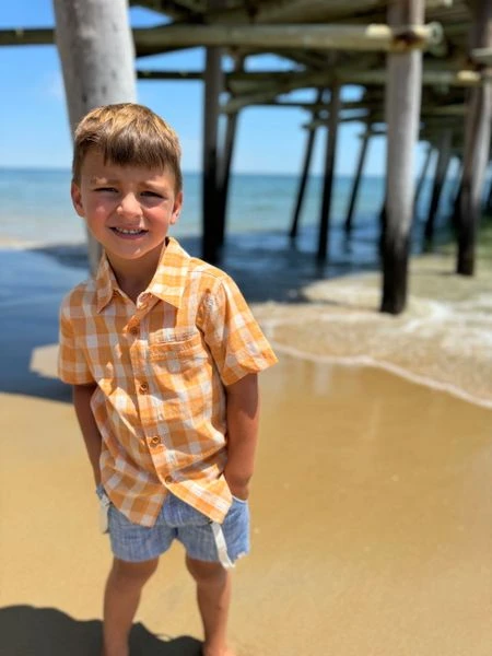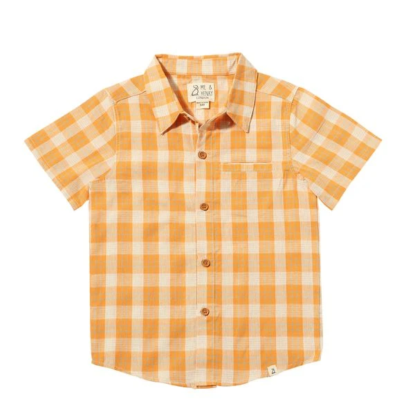 Bright, bold, and full of personality, this tangerine and grey plaid woven shirt is the perfect addition to your little oneโs wardrobe!
