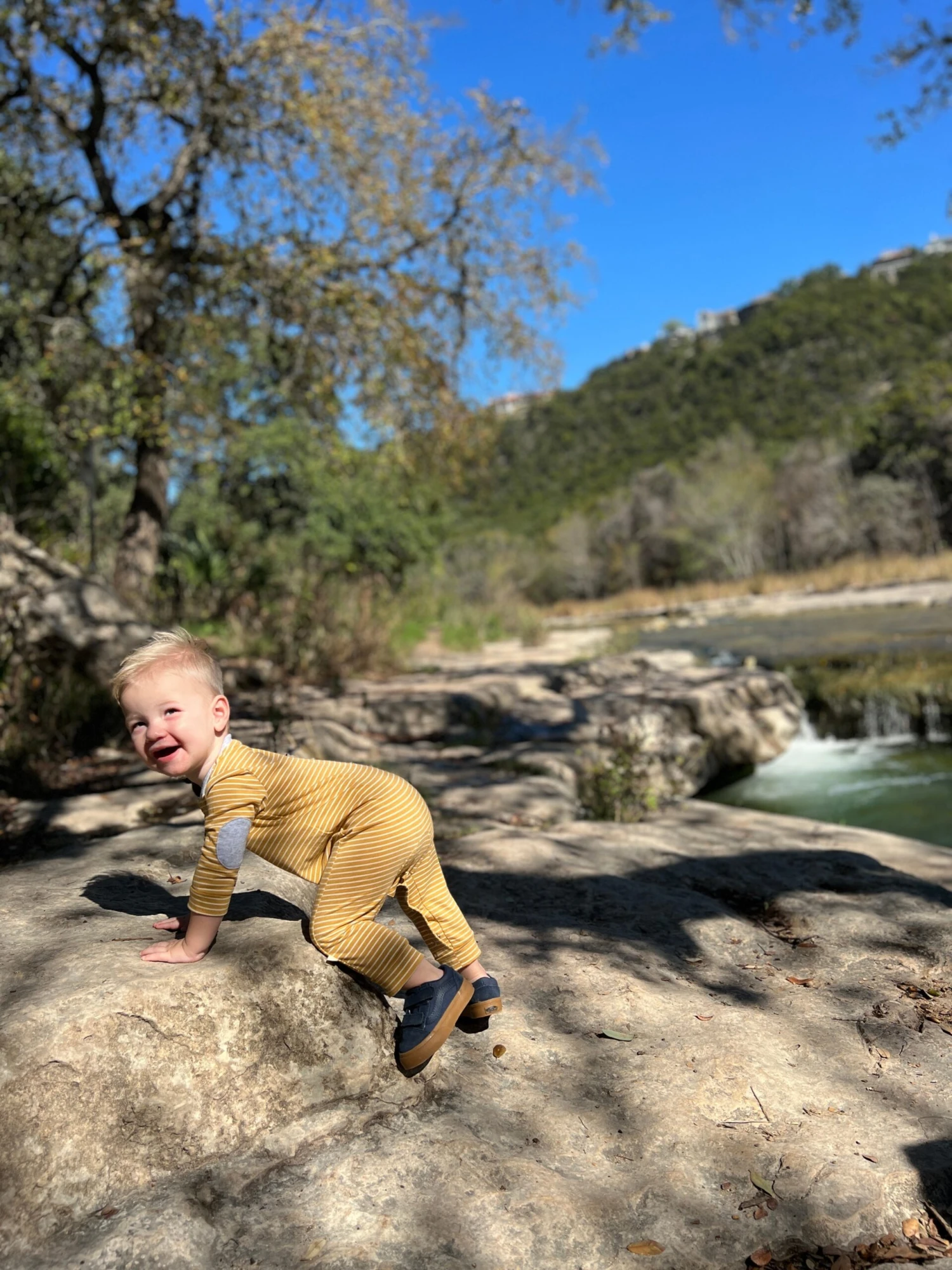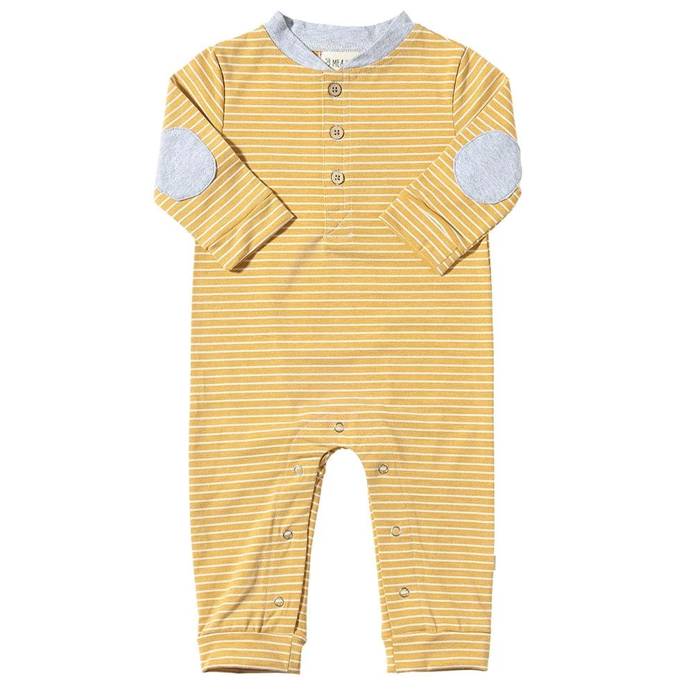 This charming Henley romper is the perfect fit for a fall day out with your little one. With its classic stripes, it’s a must-have for the season. Have you seen the cute little elbow patches?