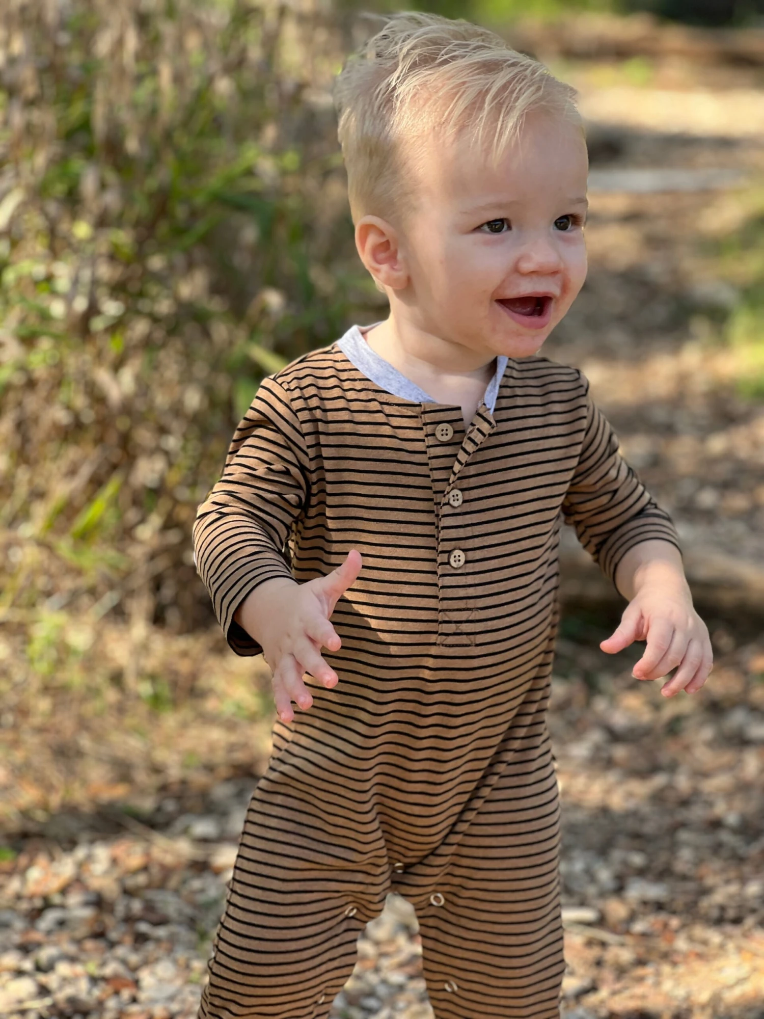 This charming Henley romper is the perfect fit for a fall day out with your little one. With its classic stripes, it’s a must-have for the season. Have you seen the cute little elbow patches?
