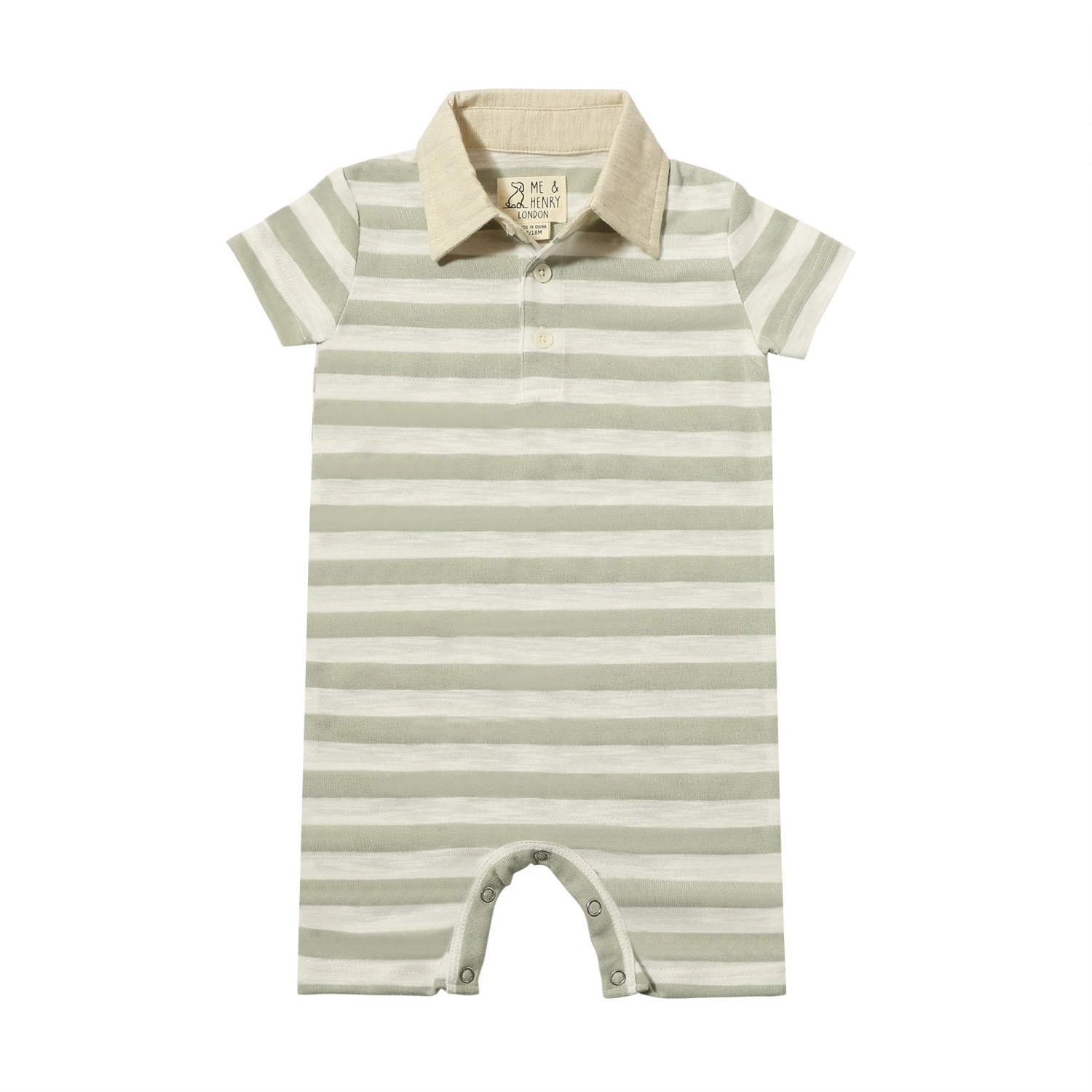A classic striped pattern with a sporty polo design for a chic, laid-back look. The grey wide stripes provide a soft understated base and the white stripes offer a crisp and clean color contrast. This jersey romper is perfect for casual outings, daytime activities, or even relaxed evening events.