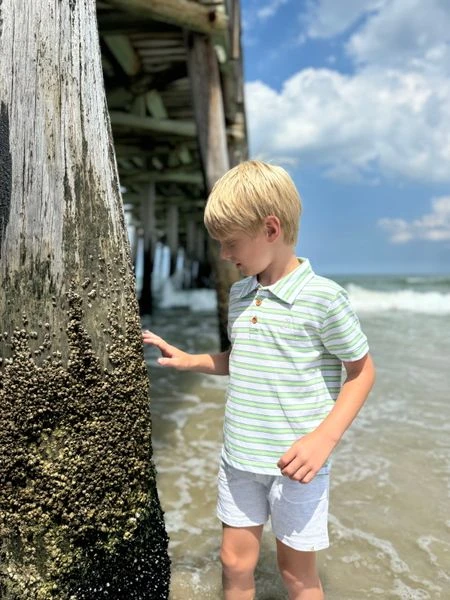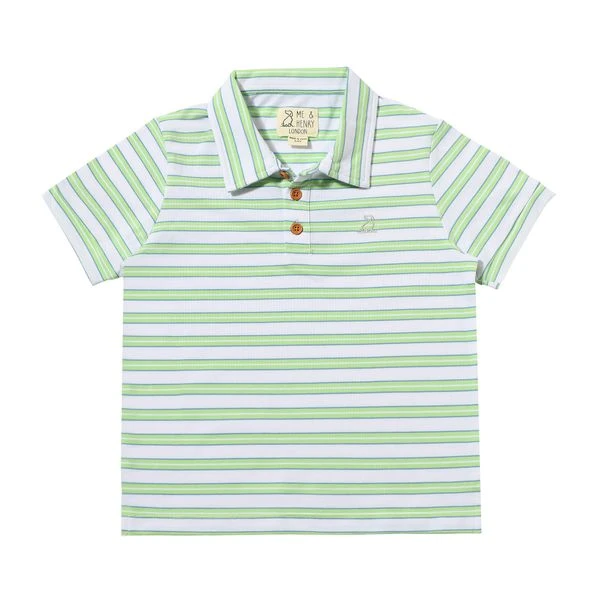 Add a burst of colour and energy to your little one’s wardrobe with the lime, white and blue stripe pique polo!