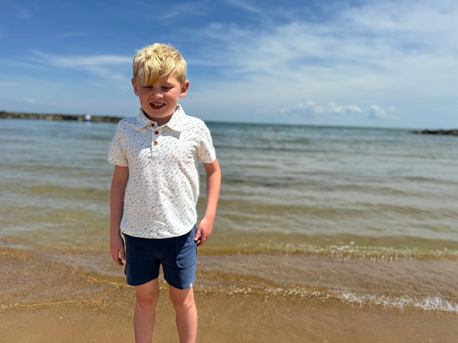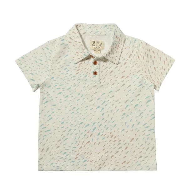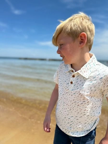 Featuring a playful print of blue and beige fish on a soft tan background, this polo brings a splash of the ocean to his everyday wardrobe.